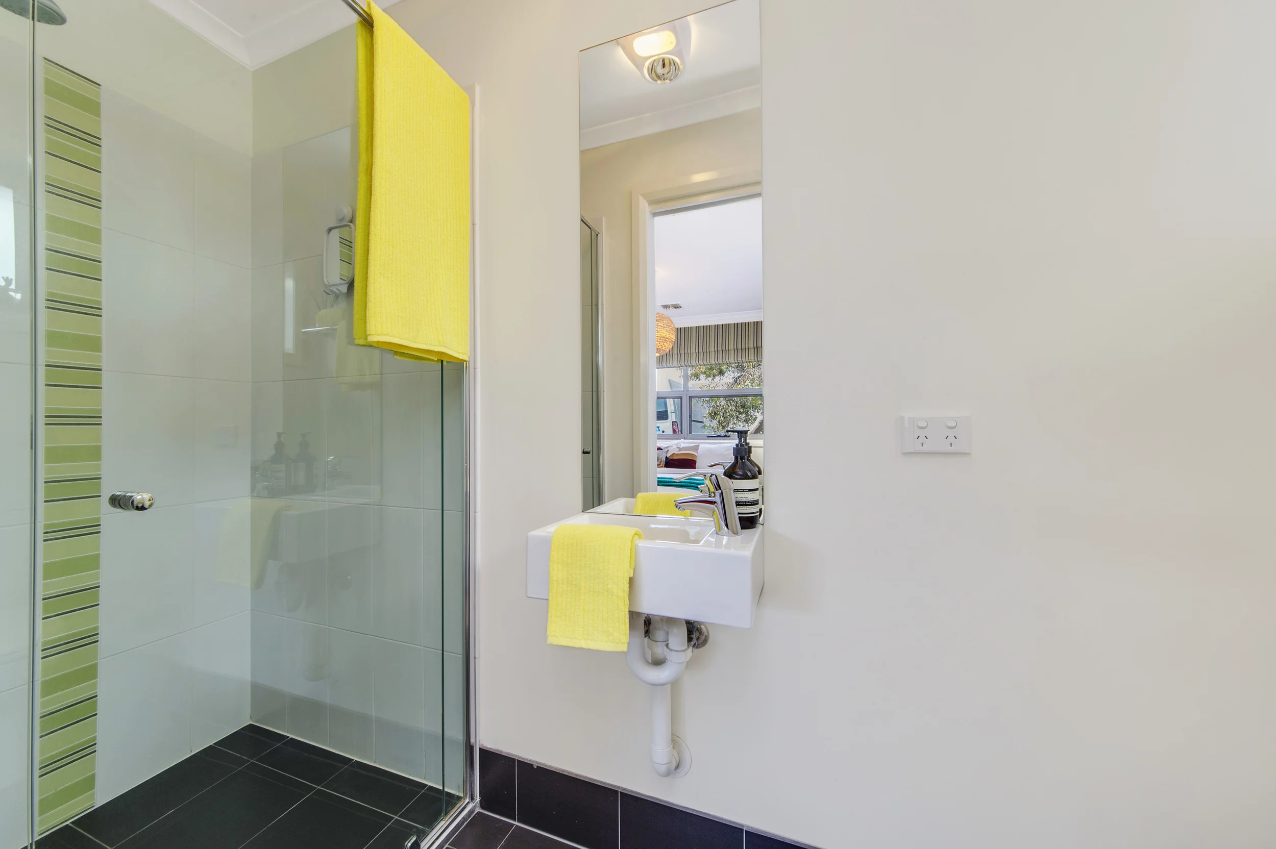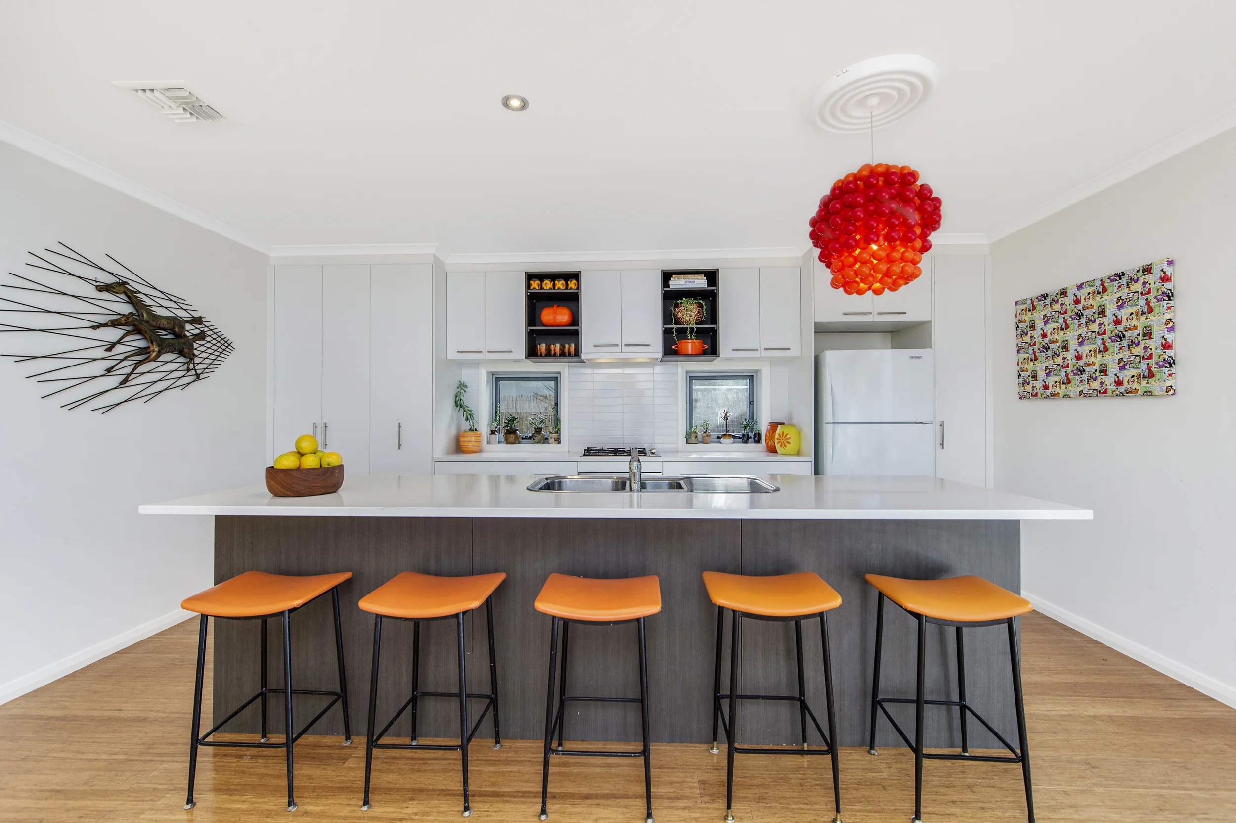 This property in Forde looked like many others in the suburb from the outside but inside the owners had incorporated wallpaper as a way of introducing colour and character to their home. Wallpaper has made a big comeback and one feature wall can add glamour and warmth to any room, as you can see below in the photos. In addition, the vendors owned some fabulous retro pieces such as an original Verner Panton pendent light hanging over the end of the kitchen bench, orange retro stools and a large macrame wall hanging in the hallway. These statement pieces meant the home had plenty of personality for us to work with. We continued with the retro theme in the living areas which really worked with the proportions of the space. The photos illustrate how colour really does bring a home to life and we often wonder why people shy away from incorporating bold pops of colour into their decorating schemes?