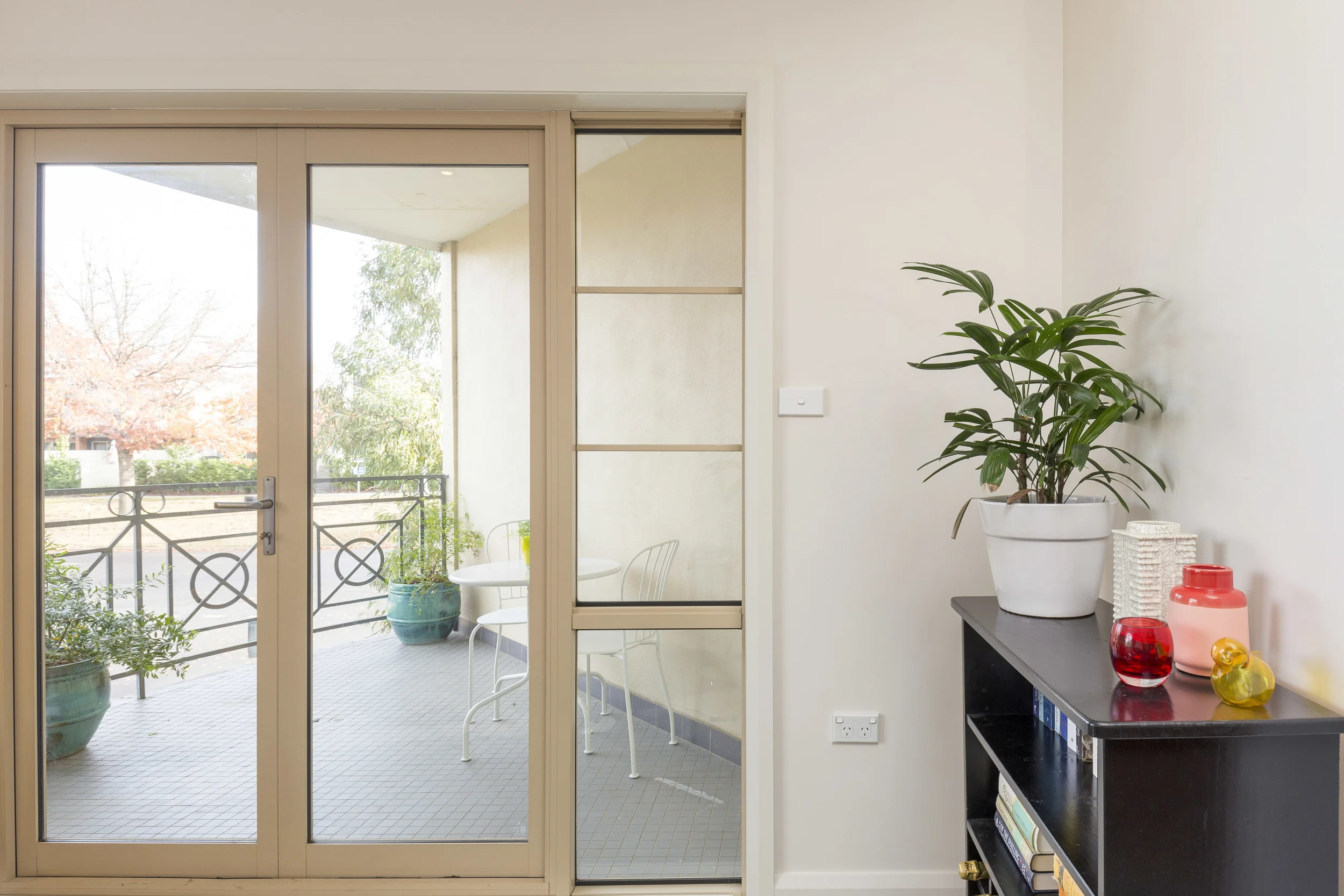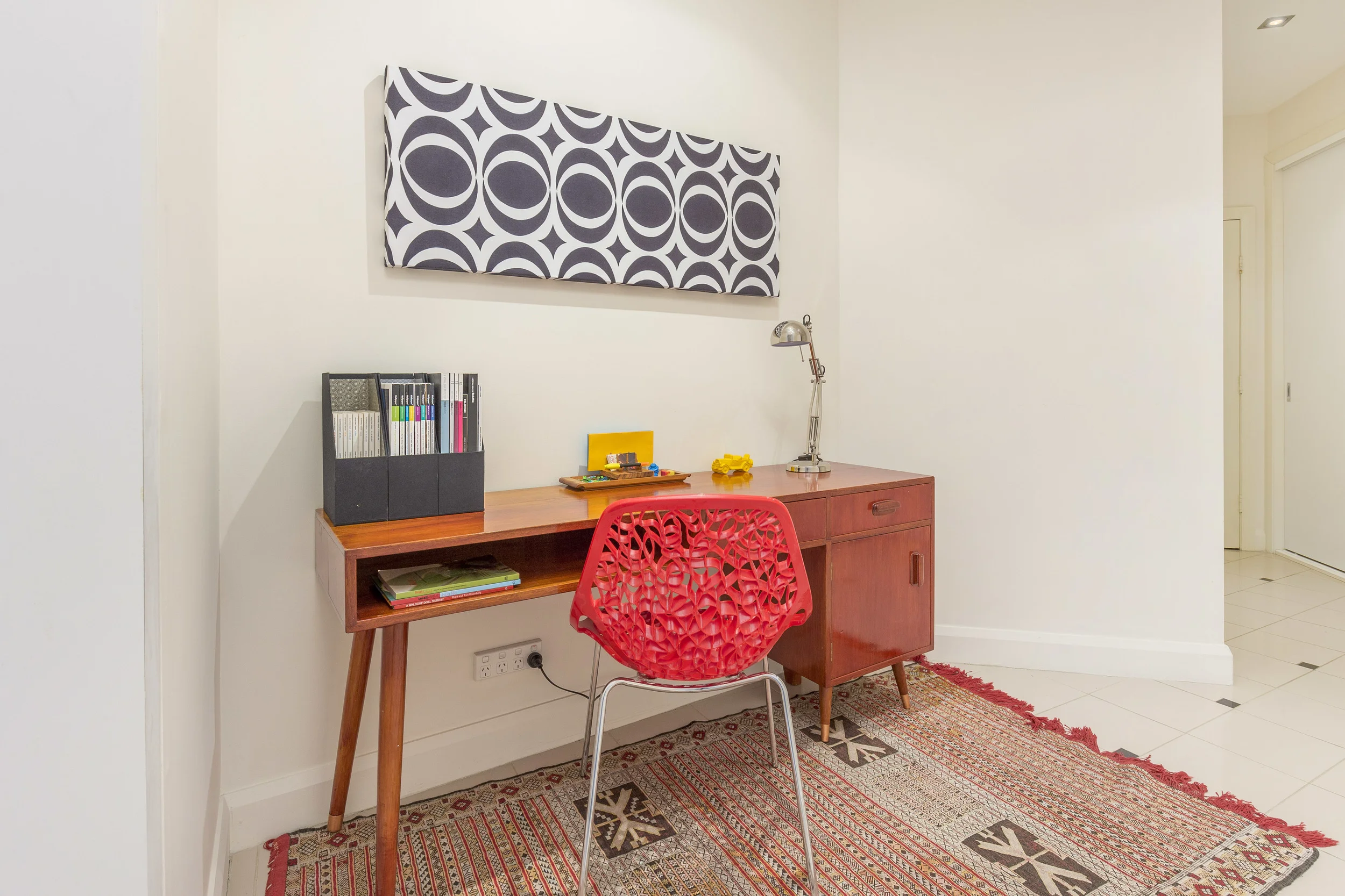 The unusual feature of this apartment was the angled walls creating asymmetrical rooms in the living areas. It made it particularly tricky in terms of furniture placement so as to ensure balance and traffic flow through the apartment. Furniture placement was also critical to demonstrate to potential buyers that unconventional room shapes could still be functional spaces to live in. In the entry, there was a nook that clearly lent itself to a study/work area. Instead of it being a 'dead' space, we illustrated how practically it could be used.